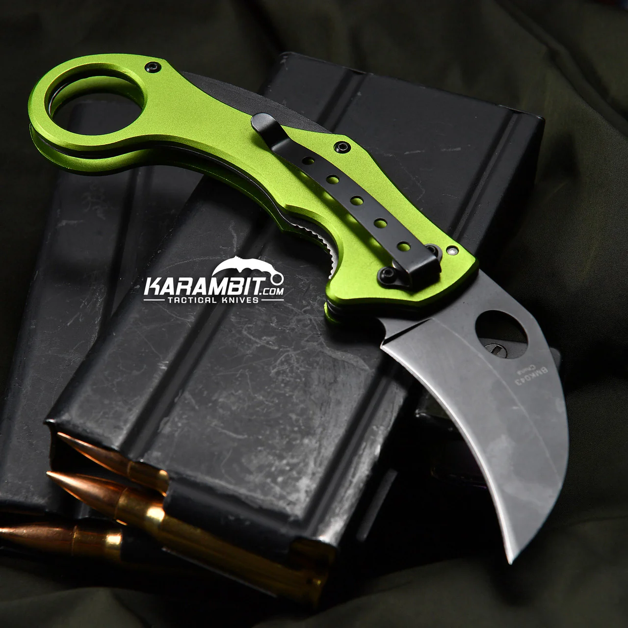 The BenchMark Venom Folding Karambit offers an extremely low-cost introduction to the world of karambits. This budget karambit features a minimally curved 2 1/2" black finish stainless curved blade, a 4 7/8" closed length, and a safety ring. The neon green aluminum handles provide a secure, easily cleaned grip. The front handle has black composition inlay trim and the Venom karambit features a black finish stainless pocket clip.